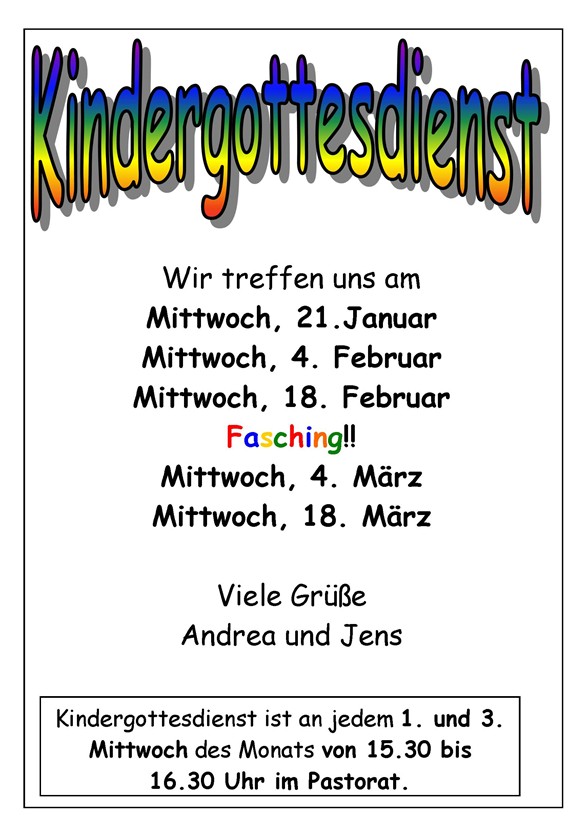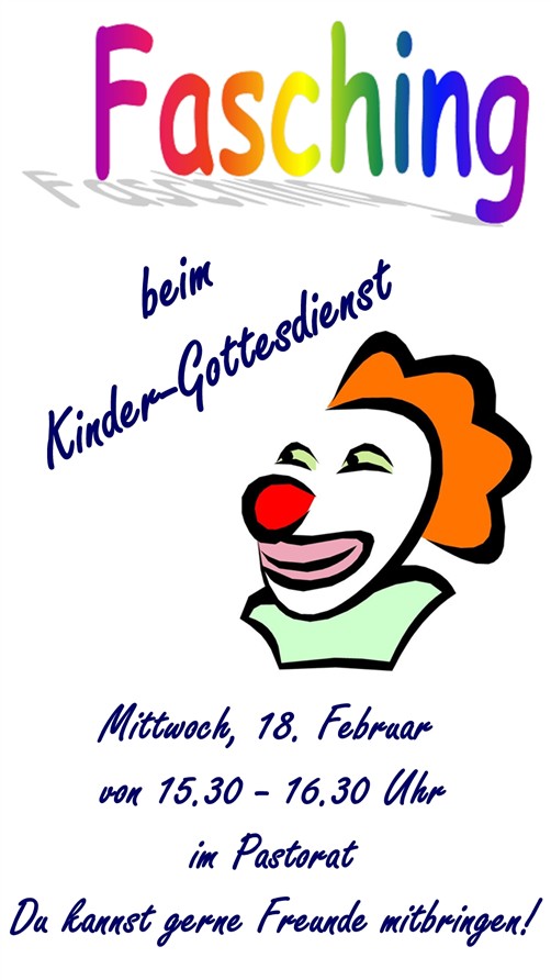 Kindergottesdienst: Immer am 1. und 3. Mittwoch eines Monats um 15.30 Uhr. Das nächste Mal am 18. Februar. Wir feiern Fasching!